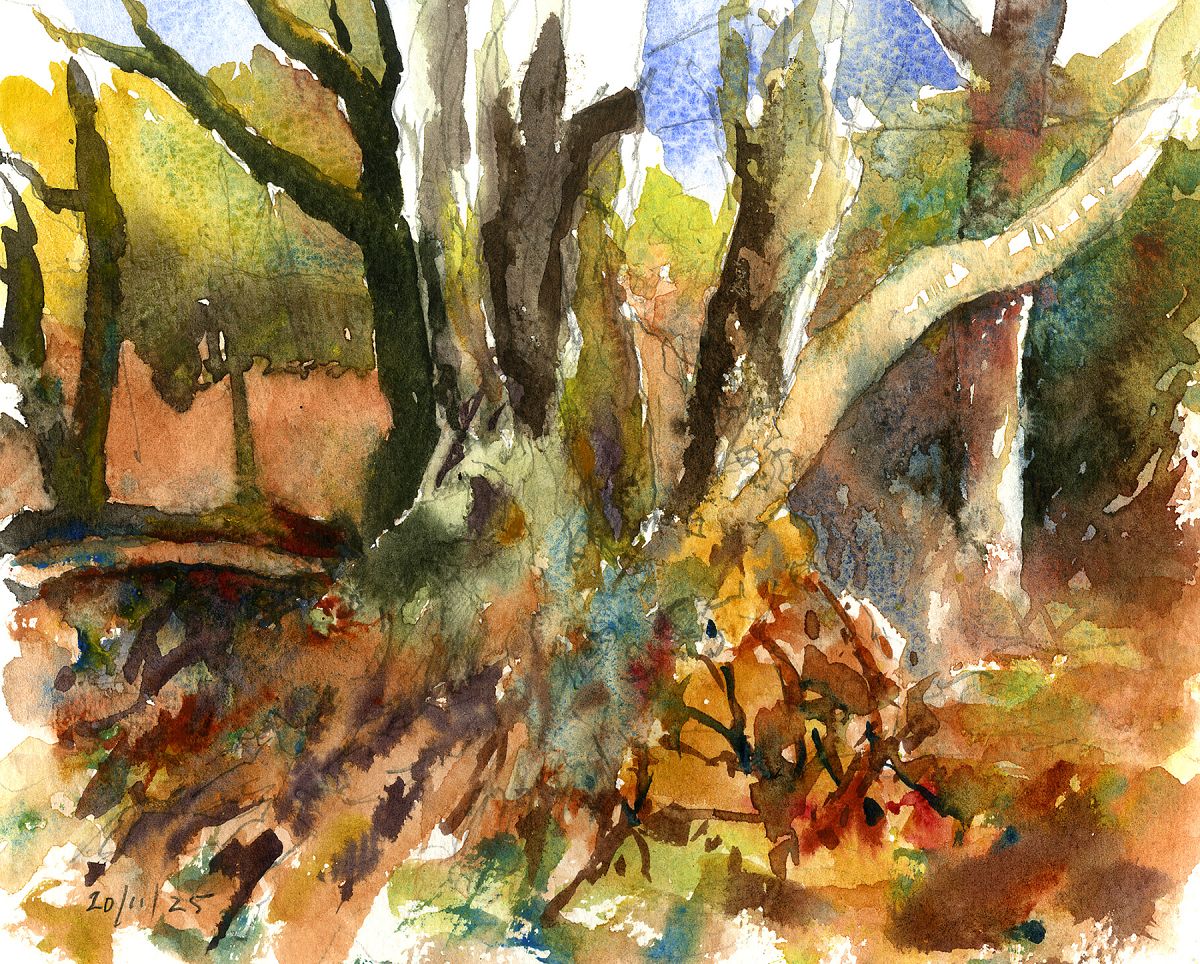 showing an elegantly leaning sweet chestnut (?) casting shadows across to the adjacent holly. In the background the silver birches add contrast to the wood beyond and, together with the dead tree stump, work well in creating a pleasing composition. Pencil completed on-site with colour added back in the studio. Watercolour over pencil in sketchbook size 190 x 280mm on