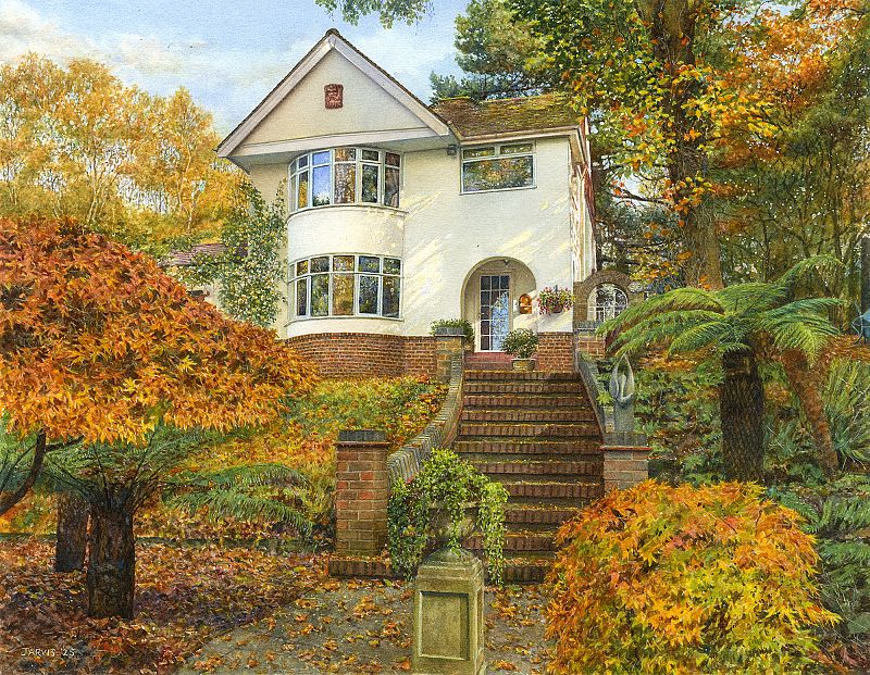 showing an autumnal view of a typical 1930's house in its beautiful grounds in Hampshire. Image size 330 x 430mm on 140Ib Arches Cold Pressed